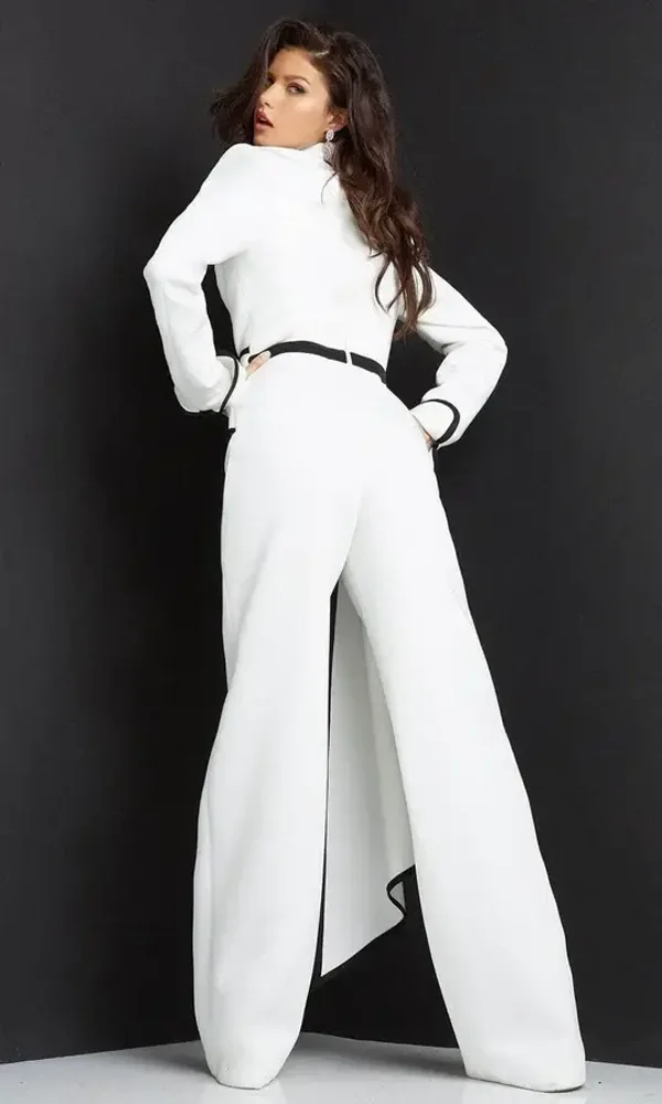 Capture the glamour as you walk on this stunning gorgeous Sidelove 4456 masterpiece. Divinely tailored with contrasting trim on scuba silhouette, this elegant piece showcases a notched collar plunging V-neckline, fully closed back and long sleeves with fold-over cuffs detail. Highlighted with a wide belt that flows from one side, this ensemble is completed with a high waist wide straight-leg pants that cascades down to a full-length hem. Breeze through your special day while making a stylish statement in this Jovani creation. Model is wearing the White/Black variant.