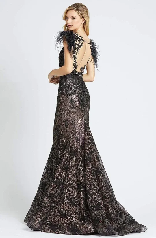 Mac Duggal Black White Red - 79230R Feathered Lace Mermaid Gown